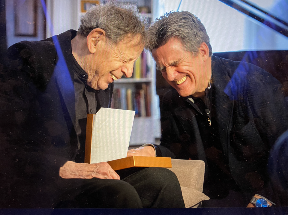 Having fun with composer Philip Glass at his apartment in New York City